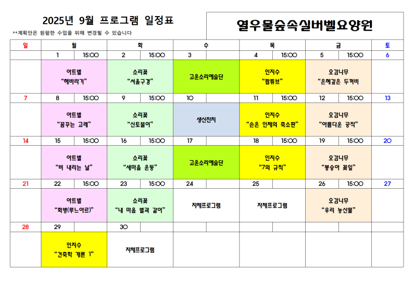 2025년 9월 열우물숲속실버벨요양원 프로그램일정표입니다.